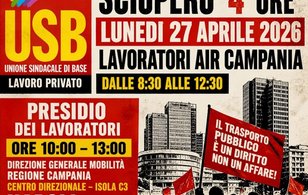 Lunedì 27 aprile 2026 sciopero di 4 ore che interesserà il personale dipendente di AIR Campania, dalle 8:30 alle 12:30. Nella stessa giornata è previsto un presidio dei lavoratori, dalle ore 10:00…
