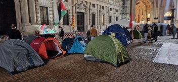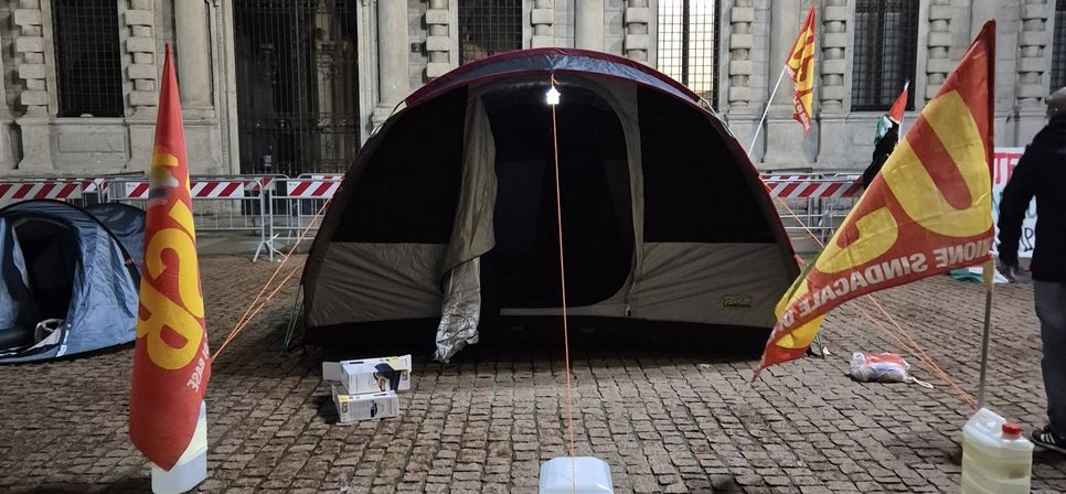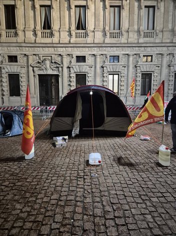 Sono state montate diverse tende, oltre quella di USB: quelle delle associazioni palestinesi, dei militanti di Potere al Popolo, degli studenti di Cambiare Rotta e OSA che insieme richiedono la cessazione dell’attacco genocida a Gaza e in Palestina, l’interruzione di ogni rapporto economico e istituzionale con Israele e sicurezza per la Global Sumud Flottilla costantemente sotto attacco.