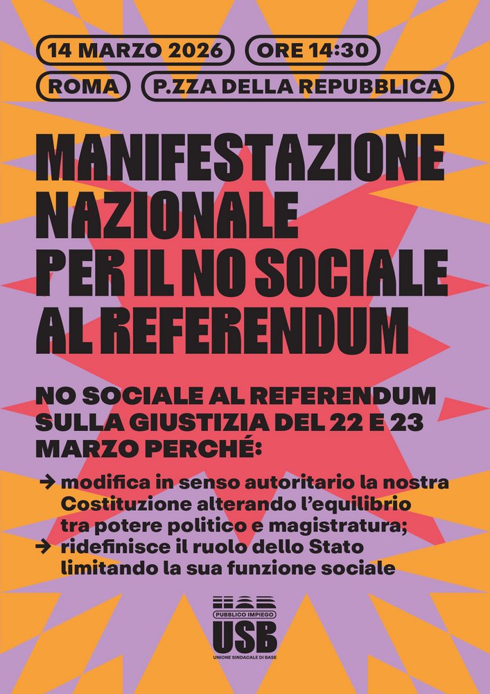 La manifestazione nazionale del 14 marzo nasce dentro la campagna per il NO sociale al referendum del 22 e 23 marzo, ma il contesto di queste settimane ne ha ampliato ulteriormente il significato politico: costruire una risposta sociale alle politiche del governo Meloni e alla crescente militarizzazione dello scenario internazionale.