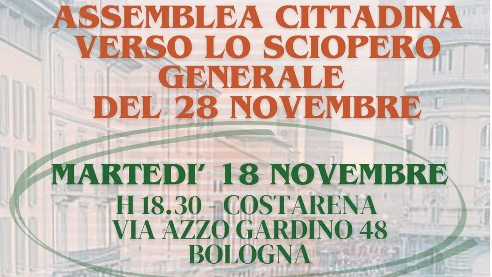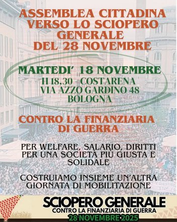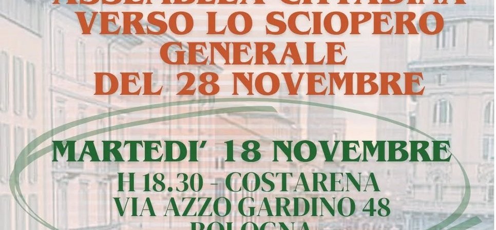 Invitiamo tutti e tutte all'assemblea pubblica il giorno 18 novembre ore 18.30 presso il C.S. CostArena in Via Azzo Gardino 48 per costruire insieme un'altra grande giornata di mobilitazione in occasione dello sciopero dell 28 novembre.