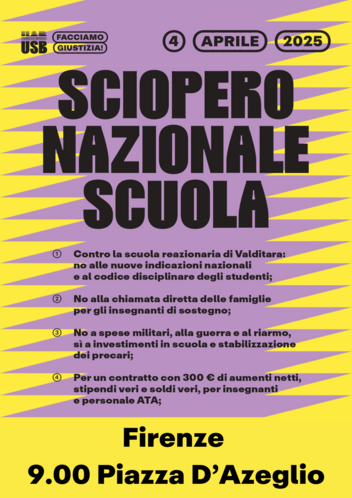 Il 4 aprile USB Scuola e USB Università scioperano contro un rinnovo contrattuale che determinerebbe di fatto un impoverimento dei docenti e del personale ATA, contro la chiamata diretta degli insegnanti di sostegno da parte delle famiglie, contro gli investimenti in armamenti che impediscono gli investimenti in scuola e istruzione e in ogni settore del servizio pubblico, contro la riforma degli istituti tecnici e professionali, le reazionarie linee guida per il primo ciclo, classiste e razziste, contro il mercimonio di titoli abilitanti, per l’assunzione dei precari in I fascia delle GPS e dei vincitori e degli idonei dei concorsi banditi per rinvigorire la Scuola Pubblica Statale.