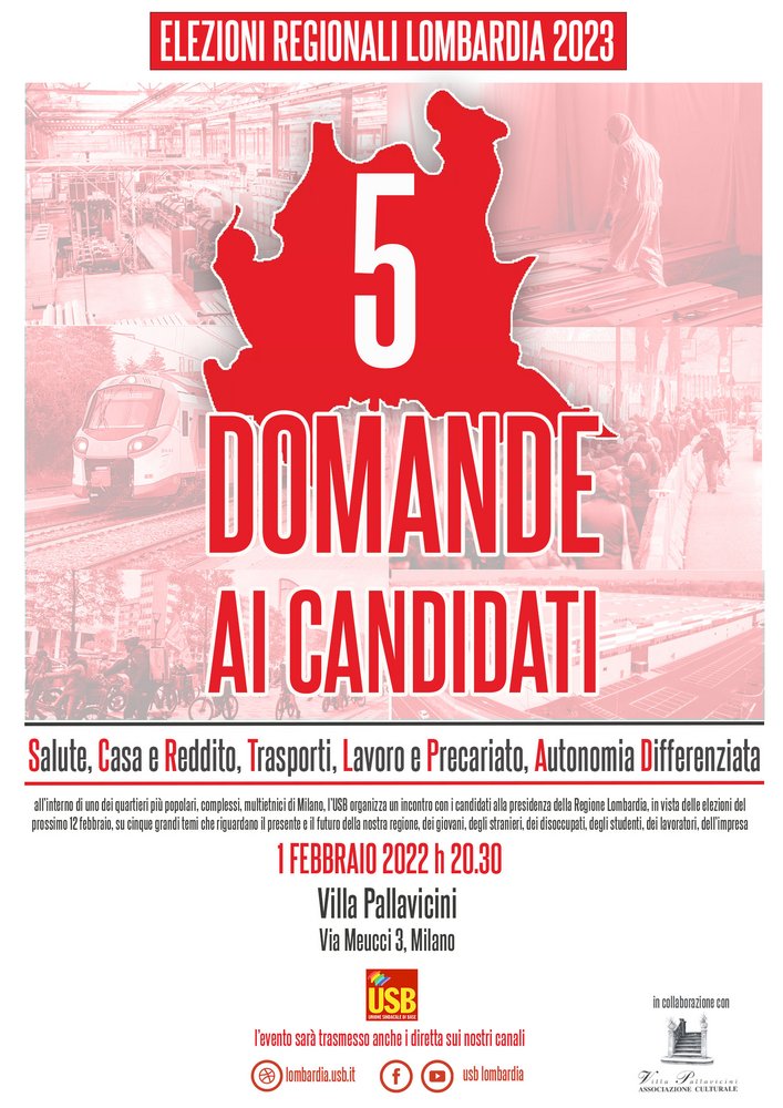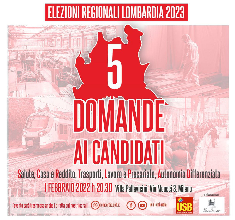 In vista delle elezioni regionali del 12 febbraio, USB Lombardia ha invitato i candidati alla Presidenza della regione Lombardia ad un confronto pubblico, per il 1 febbraio alle ore 21 presso la sala di Villa Pallavicini in via Privata Meucci 3 a Milano.