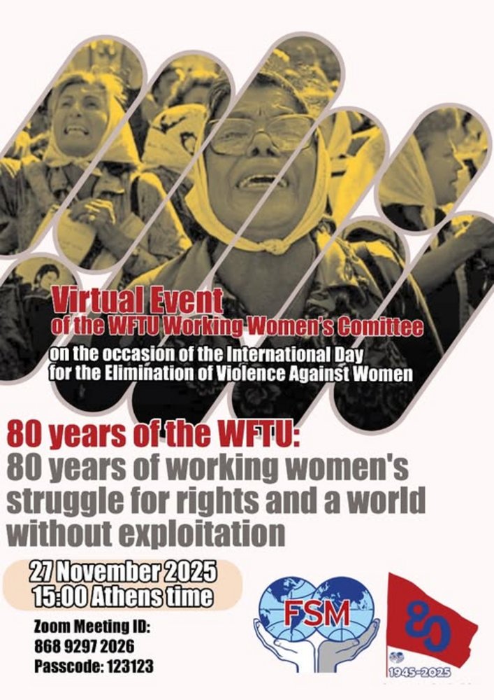 Il 25 novembre, Giornata Internazionale per l’Eliminazione della Violenza contro le Donne, la World Federation of Trade Unions (WFTU) rinnova la propria lotta per un mondo libero dalla violenza, dallo sfruttamento e dalla guerra, ricordando che nel 2025 celebriamo anche gli 80 anni di impegno sindacale internazionale al fianco delle lavoratrici e dei lavoratori di tutto il mondo.