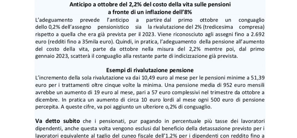L’adeguamento prevede l’anticipo a partire dal primo ottobre un conguaglio dello 0,2% dell’assegno pensionistico sia la rivalutazione del 2% (tredicesima compresa) rispetto a quella che era già prevista per il 2023. Viene riconosciuto agli assegni fino a 2.692 euro (redditi fino a 35mila euro). Quindi, in pratica, l’adeguamento della pensione all’aumento del costo della vita, parte da ottobre nella misura del 2,2% mentre poi, dal primo gennaio 2023, scatterà il conguaglio alla restante parte di indicizzazione già prevista.