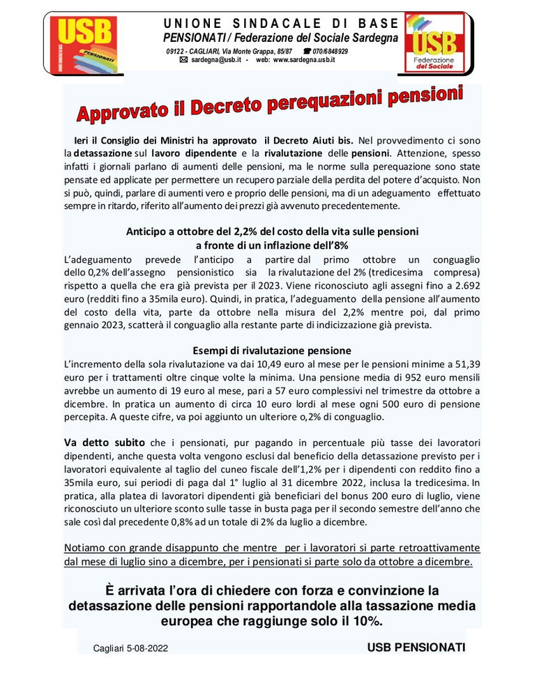 Ieri il Consiglio dei Ministri ha approvato il Decreto Aiuti bis. Nel provvedimento ci sono la detassazione sul lavoro dipendente e la rivalutazione delle pensioni. Attenzione, spesso infatti i giornali parlano di aumenti delle pensioni, ma le norme sulla perequazione sono state pensate ed applicate per permettere un recupero parziale della perdita del potere d’acquisto. Non si può, quindi, parlare di aumenti vero e proprio delle pensioni, ma di un adeguamento effettuato sempre in ritardo, riferito all’aumento dei prezzi già avvenuto precedentemente.