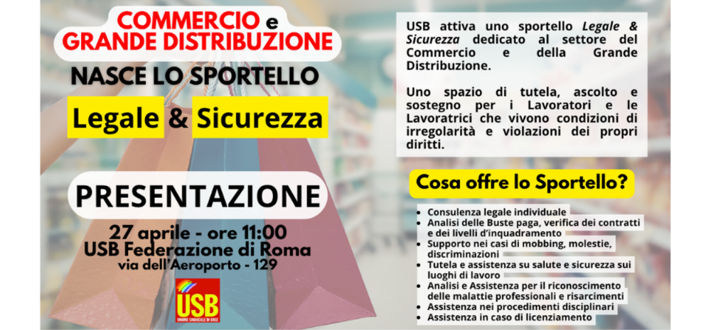 USB annuncia l’apertura di un nuovo sportello legale e per la sicurezza dedicato al settore del Commercio e GDO, pensato per offrire supporto concreto a chi ogni giorno affronta turni massacranti, pressioni indebite, irregolarità contrattuali, demansionamenti, discriminazioni e abusi nei luoghi di lavoro. Allo sportello legale si affiancherà anche la consulenza in materia di salute e sicurezza per rafforzare gli interventi anche a tutela della salute e monitorare le condizioni di lavoro e analizzare l'insorgere di eventuali malattie professionali.