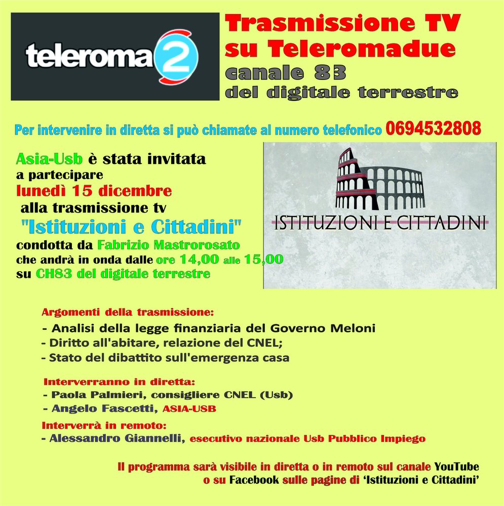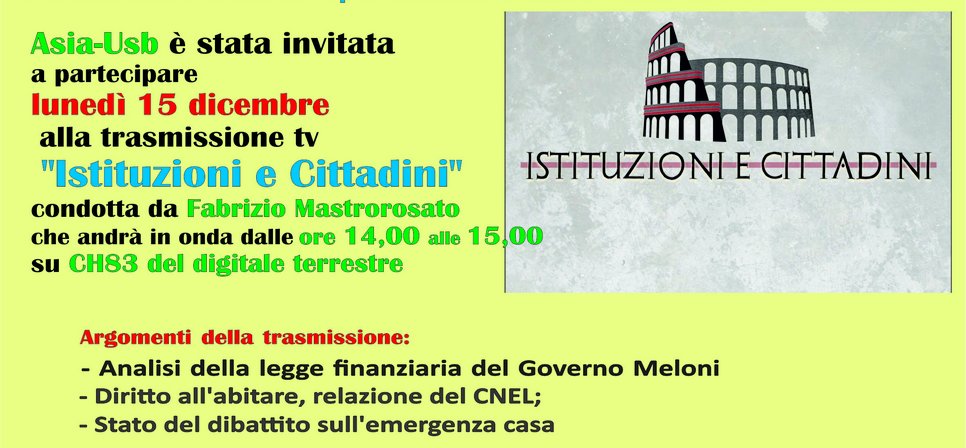 Asia-Usb è invitata a partecipare lunedì 15 dicembre (dalle ore 14,00 alle ore 15,00) alla trasmissione tv "Istituzioni e Cittadini" condotta da Fabrizio Mastrorosato sul tema del diritto all'abitare.