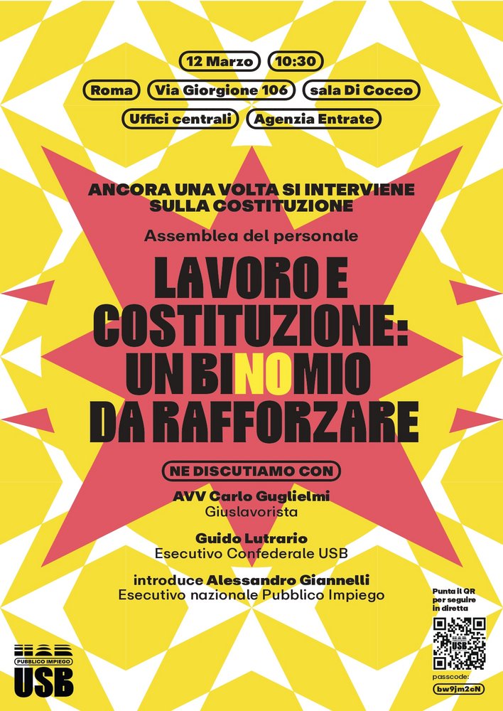 Giovedì 12 marzo dalle 10.30 alle 12.30 Usb Agenzie fiscali ha indetto un' assemblea in presenza presso gli Uffici Centrali (via Giorgione 106 sala Di Cocco) dal titolo "Lavoro e Costituzione: un binomio da rafforzare" nel quale affronteremo anche il tema del referendum sulla giustizia del 22 e 23 marzo.