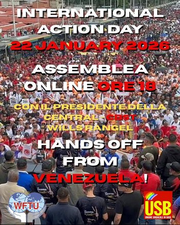 In occasione della giornata mondiale di azione WFTU sul Venezuela USB organizza un’assemblea online il 22 gennaio alle ore 18:00, sarà in collegamento il presidente della Central CBST Wills Rangel. Già le mani dal Venezuela, fermiamo l’imperialismo!