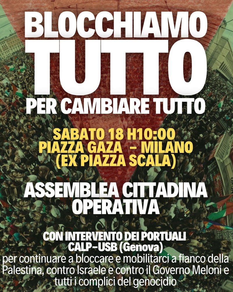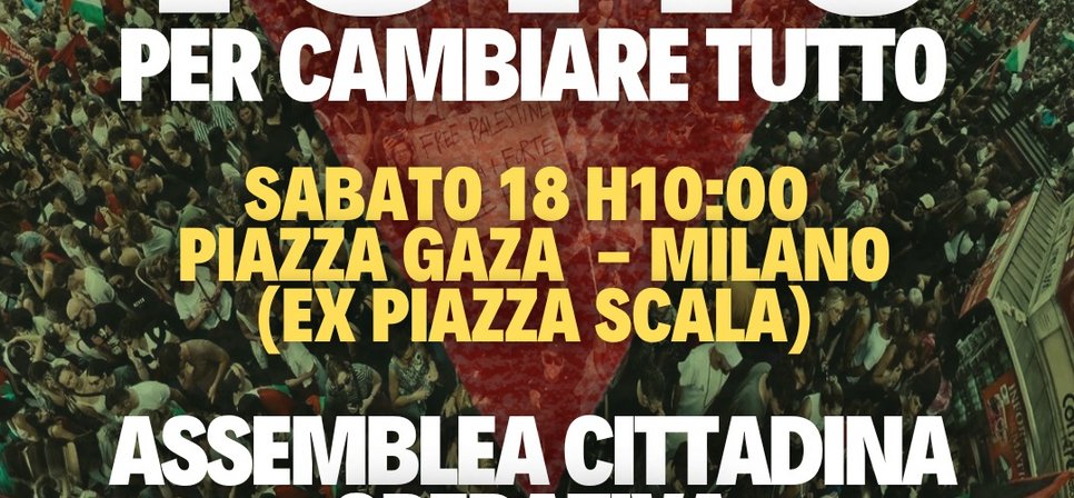Così faremo anche a Milano con un primo appuntamento per costruire l'assemblea permanente operativa cittadina sabato 18 ottobre dalle ore 10 in quella piazza della Scala diventata per tutti piazza Gaza, dopo le tendate del presidio permanente a seguito dello sciopero generale del 22 e verso quello del 3. Punto di riferimento, incontro e partecipazione, attraversata dai tanti cortei e momenti di mobilitazione dell'ultimo mese, nonché rappresentazione della pressione permanente che continueremo ad esercitare anche su Palazzo Marino per rompere ogni rapporto con Israele.