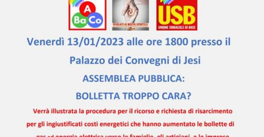 Venerdì 13 gennaio alle ore 18.00, si terrò a Palazzo dei Convegni di Jesi un'assemblea cittadina con il tema “ Bollette Troppo Care”.