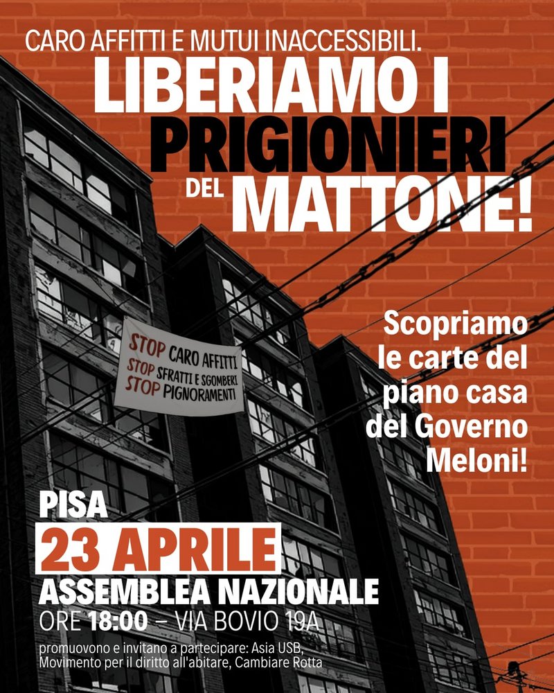 Vediamoci insieme il 23 aprile alle ore 18,00 a Pisa in via Via Bovio 19 Pisa, per iniziare a costruire, nelle città e nei nostri territori, la liberazione dal ricatto del mattone.