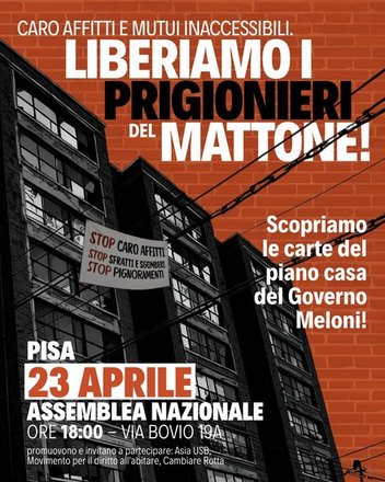 Vediamoci insieme il 23 aprile alle ore 18,00 a Pisa in via Via Bovio 19 Pisa, per iniziare a costruire, nelle città e nei nostri territori, la liberazione dal ricatto del mattone.