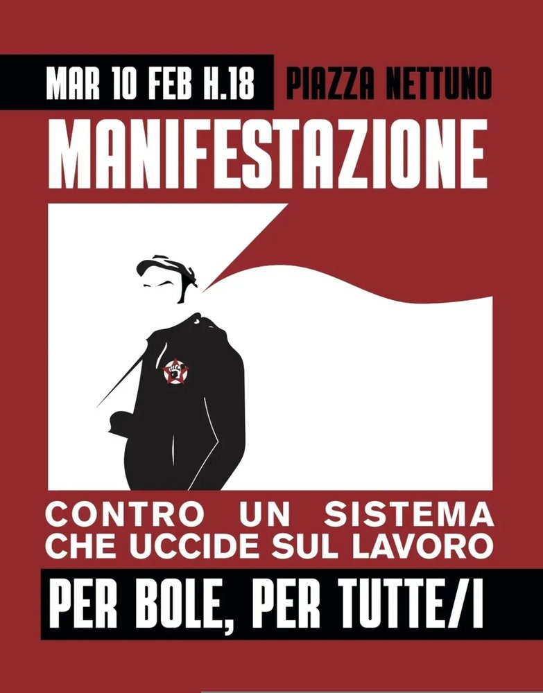 Oggi lunedì 9 febbraio, si terrà una conferenza stampa per illustrare le ragioni e le modalità della manifestazione cittadina che si svolgerà in giorno successivo, martedì 10 dalle ore 18.00 a Bologna. Una manifestazione dal titolo “Contro un sistema che uccide sul lavoro, per Bole e per tutti e tutte” che mette al centro la continua strage dei morti sul lavoro.