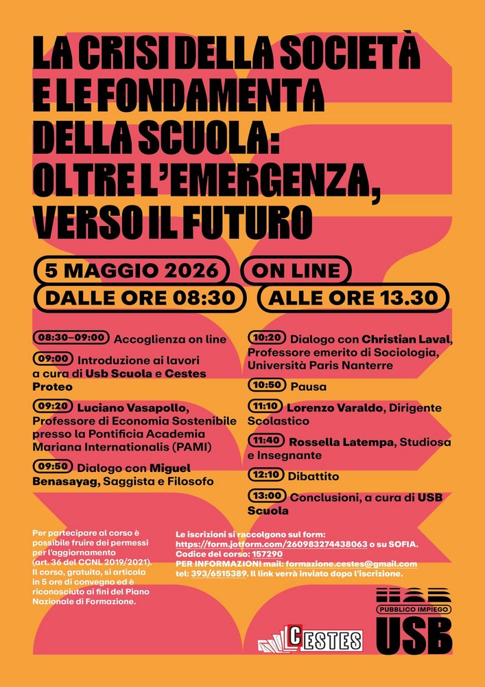 Il Centro Studi CESTES e USB Scuola propongono una giornata di formazione e riflessione per analizzare il legame indissolubile tra sistema d’istruzione e società. Non si tratta solo di trasmettere saperi, ma di trasformare la scuola in un presidio di coesione sociale e in un laboratorio di pace e solidarietà tra i popoli.