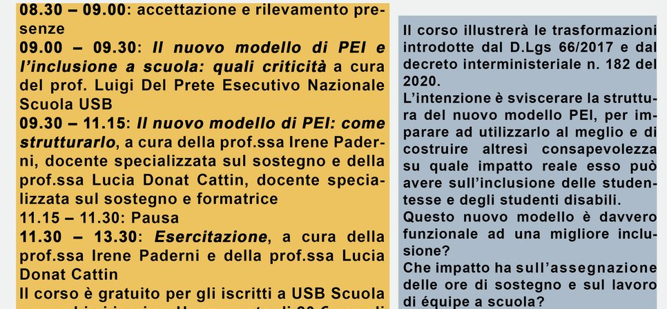 09.00 – 09.30: Il nuovo modello di PEI e l’inclusione a scuola: quali criticità a cura del prof. Luigi Del Prete Esecutivo Nazionale Scuola USB.