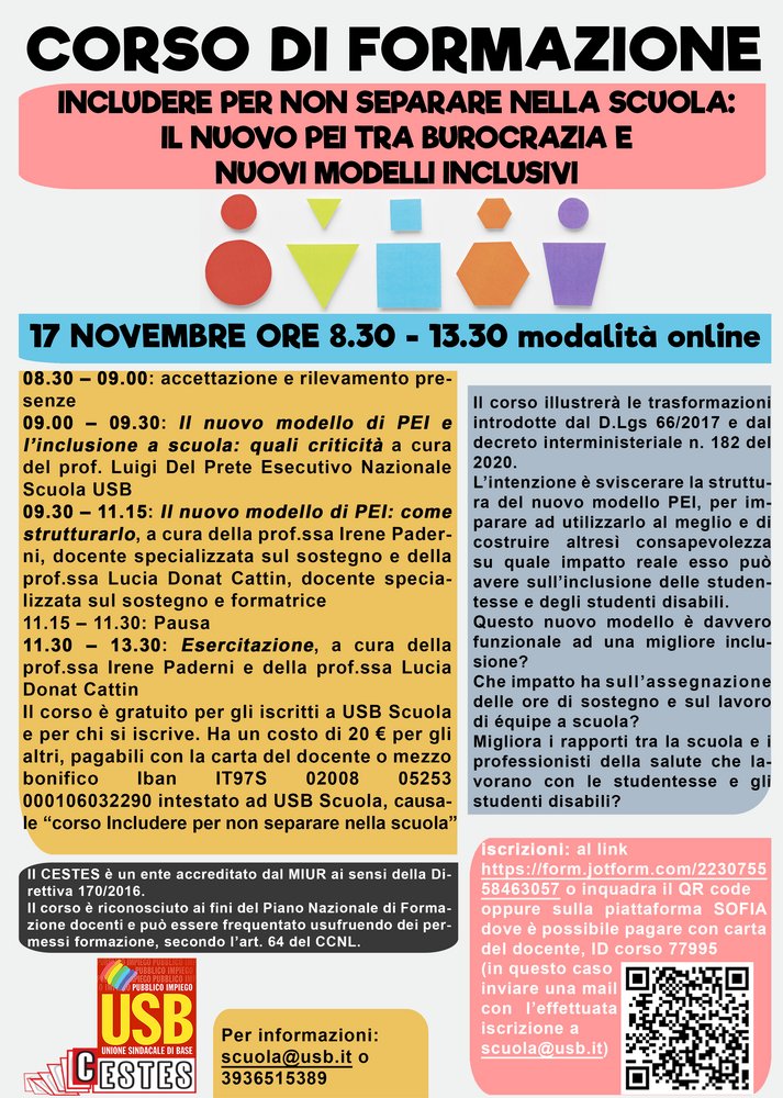 Il corso è gratuito per gli iscritti e per chi si iscrive a USB Scuola. Ha un costo di 20€ per gli altri, pagabili con la carta del docente o mezzo bonifico Iban IT97S 02008 05253 000106032290 intestato ad USB Scuola, causale “corso Includere per non separare nella scuola”.