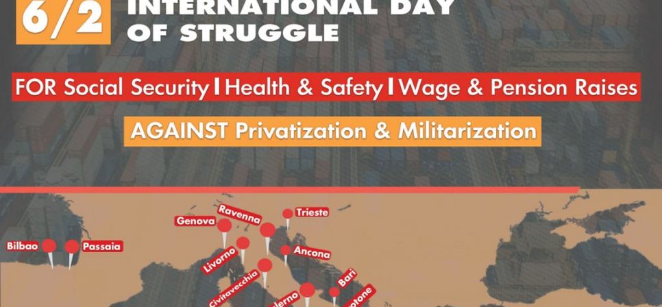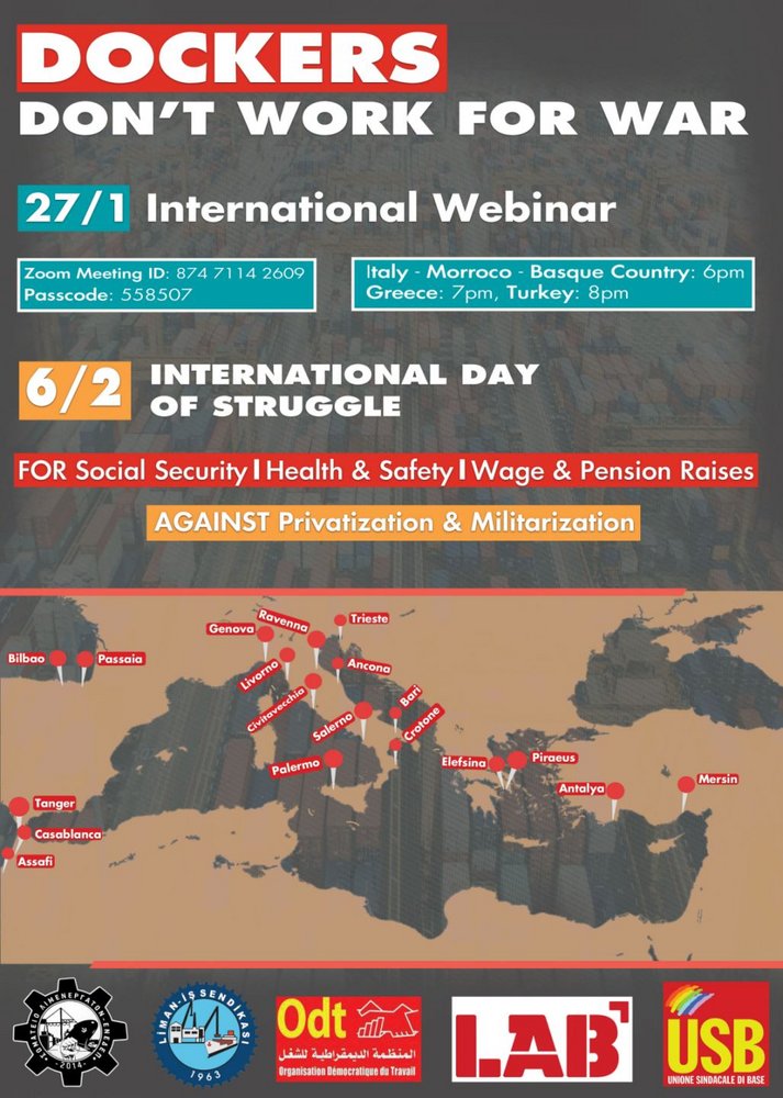 Lo sciopero internazionale verrà presentato con un webinair il prossimo 27 gennaio, alle 18:00 ore Italiana, dove oltre USB parteciperanno le altre organizzazioni promotrici (vedi locandina allegata). Alla giornata aderiranno alcuni dei principali scali del Mediterraneo come il Pireo, Bilbao, Tangeri ed Antalya; in Italia ad oggi hanno dato adesione i porti di Genova, Trieste, Livorno, Ancona, Civitavecchia, Ravenna, Salerno, Bari, Crotone e Palermo, ma altri ancora si stanno facendo avanti.