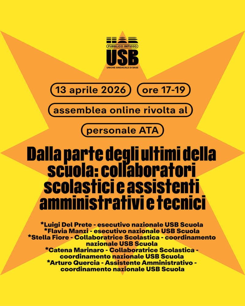 USB P.I. Scuola indice per il 13 aprile dalle ore 17 alle ore 19 un’assemblea sindacale in diretta streaming, fuori orario di servizio e pertanto senza diritto alla fruizione di permessi, destinata al personale ATA interessato per discutere dei seguenti argomenti: