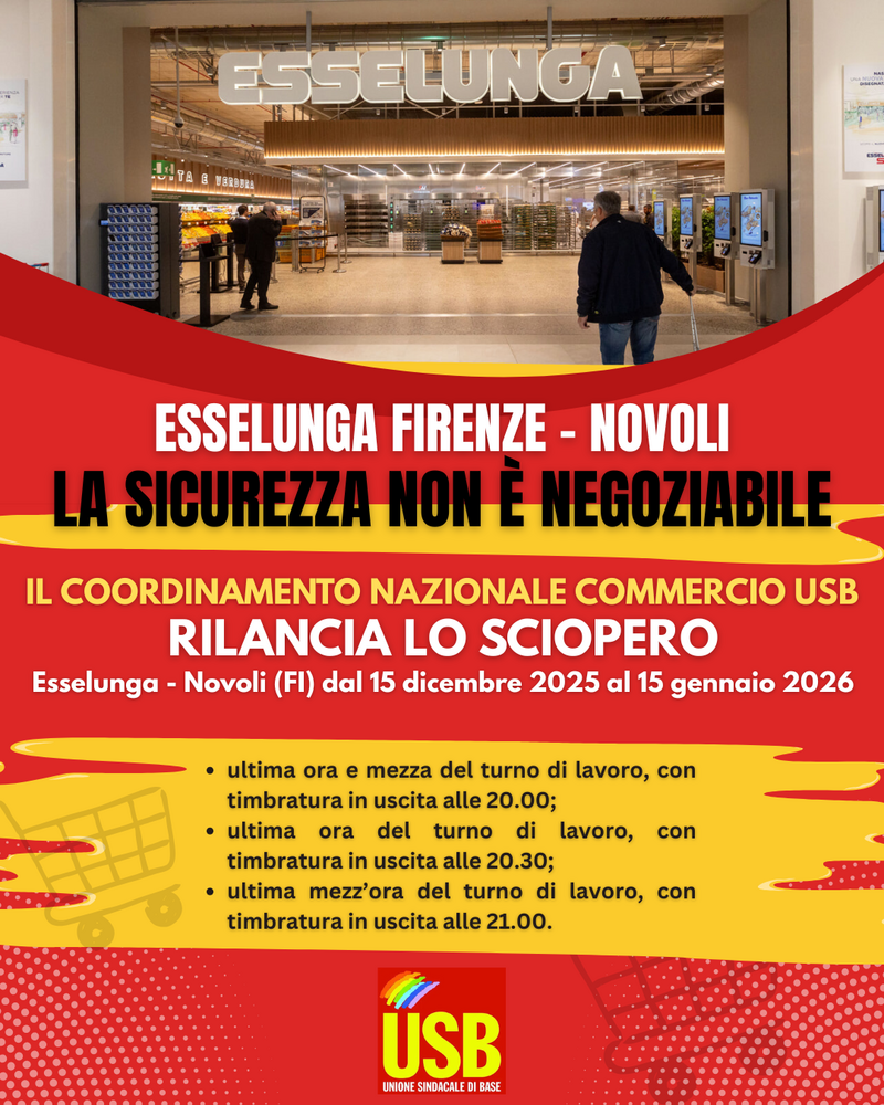 Alla luce della perdurante inerzia aziendale, USB diffida formalmente Esselunga dal proseguire in una condotta gravemente lesiva della dignità e della sicurezza dei propri dipendenti e rilancia lo sciopero proclamato da USB Lavoro Privato Firenze, che si svolgerà dal 15 dicembre 2025 al 15 gennaio 2026, articolato come segue: