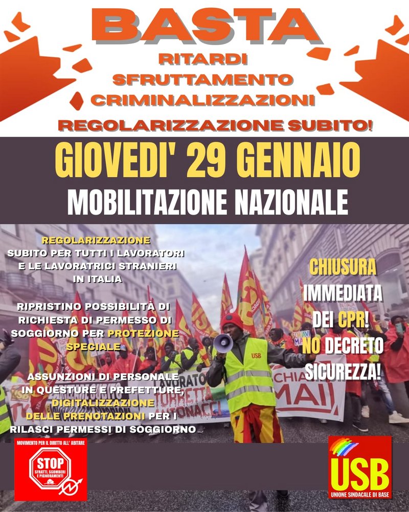 Per questo motivo come Unione Sindacale di Base e con le altre associazioni aderenti abbiamo deciso di lanciare questa giornata di mobilitazione nazionale in tutta Italia per il 29 gennaio perché i lavoratori stranieri sono stanchi di ritardi, attese, truffe, discriminazioni, prese in giro e repressione. Davanti alle Prefetture e Commissioni Territoriali lanceremo presidi e richiederemo incontri con le autorità per chiedere un cambio rotta radicale nelle politiche nei confronti di lavoratori e lavoratrici stranieri, e per dire che non ci piegheremo davanti alla deriva securitaria che il governo Meloni cerca di imprimere. La sicurezza sociale non è la caccia al migrante ma diritto all'abitare, ai documenti, a un salario degno per tutte e tutti!