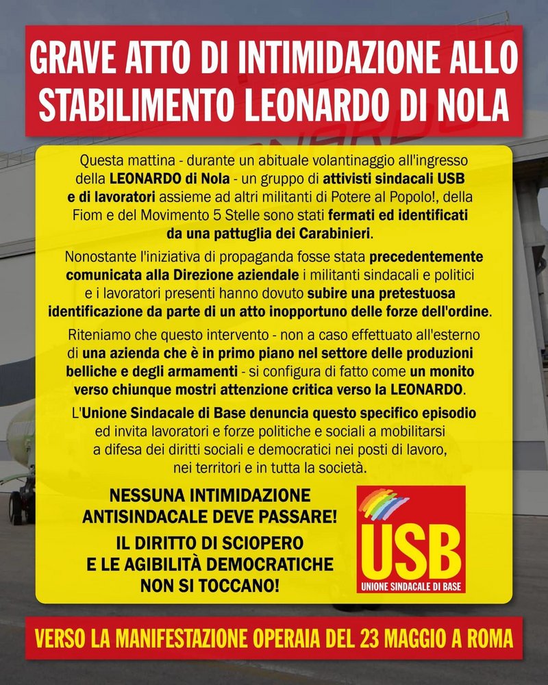Questa mattina - durante un abituale volantinaggio all'ingresso della LEONARDO di Nola - un gruppo di attivisti sindacali USB e di lavoratori assieme ad altri militanti di Potere al Popolo, della Fiom e del Movimento 5 Stelle sono stati fermati ed identificati da una pattuglia dei Carabinieri.