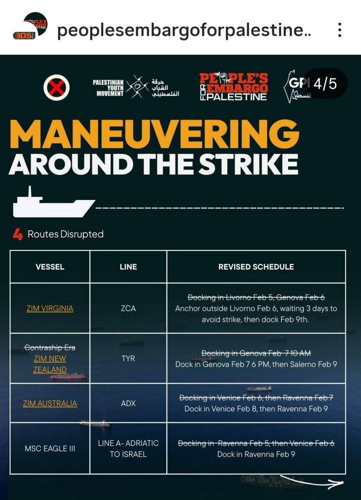 La ZIM Virginia carica di armi è ferma al largo delle coste di Livorno ma non può attraccare: c’è lo sciopero in corso dei portuali dell’USB che la blocca. La stessa costa sta succedendo alla ZIM New Zealand, che era prevista per questa mattina al porto di Genova e alla ZIM Australia, che avrebbe dovuto attraccare oggi a Venezia e domani a Ravenna. Ed anche la MSC EAGLE III, diretta in Israele, che doveva arrivare ieri a Ravenna ed era prevista per oggi a Venezia ha rimandato i suoi programmi.