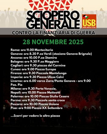 Lo sciopero generale del 28 novembre sarà un’importante giornata di lotta contro la finanziaria di guerra del Governo Meloni: in decine di città in tutto il Paese si stanno preparando le mobilitazioni contro i tagli e le politiche del riarmo, per la fine dei rapporti con lo stato israeliano e del genocidio in Palestina, per i salari e le pensioni.