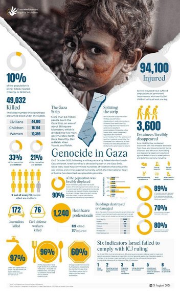 Riportiamo i dati, aggiornati al 31 agosto 2024, di Euro-Med Human Rights Monitor, che dimostrano in modo inequivocabile come in Palestina sia in corso un genocidio. L’Unione Sindacale di Base è a fianco del popolo palestinese: parteciperemo alle prossime mobilitazioni che si terranno in Italia, alle iniziative di boicottaggio e siamo pronti ad organizzare altri scioperi proteste contro il traffico di armi nel nostro paese verso zone di conflitto, come già fatto nei mesi scorsi, per fermare questo tremendo genocidio.