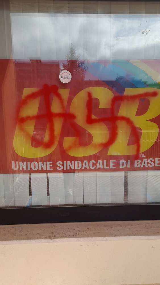 Probabilmente nella scorsa notte, un gruppo di facinorosi ha imbrattato con svastiche naziste la sede della USB Basilicata in Piazzale Bratislava a Potenza e stracciato la bandiera della Palestina, esposta da settembre per manifestare la nostra solidarietà e la condanna del genocidio che, nel silenzio quasi generale, è stato perpetrato nei confronti del popolo palestinese.