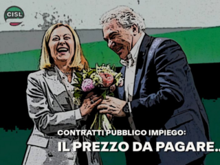 Il contributo che Meloni paga alla CISL per aver sottoscritto un contratto nazionale delle Funzioni Centrali che taglia del 10% gli stipendi del pubblico impiego e per essere l’organizzazione sindacale capofila tra quelle disponibili a firmare tutti i contratti alle medesime condizioni “stracciate”. Anche il personale della sanità, delle scuole, delle università, dei comuni, della Ricerca è atteso al varco da questa vergognosa alleanza tra la CISL e un governo neofascista, autentico, ulteriore schiaffo alla nostra storia democratica, sempre più marginale nella vita del paese.