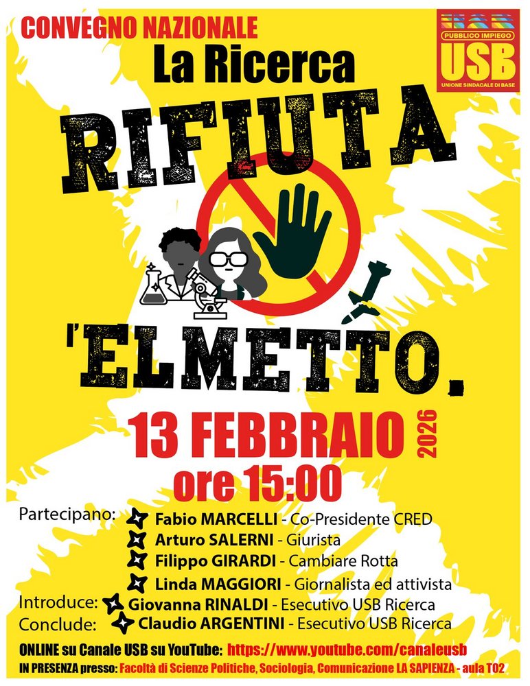 Questa situazione impone un’accelerazione netta e non più rinviabile verso il riconoscimento dell’obiezione di coscienza per le lavoratrici e i lavoratori della Ricerca Pubblica, come strumento di lotta concreta contro l’inserimento coatto nei progetti di ricerca militare. Proprio per avviare questa nuova fase di consapevolezza e conflitto, USB Ricerca ha organizzato un convegno il 13 febbraio all’Università La Sapienza. Durante il convegno cercheremo di capire come strutturare la lotta contro la deriva militarista della ricerca pubblica negli enti e nelle università italiane tenendo conto dell’esperienza di vari soggetti sociali.
