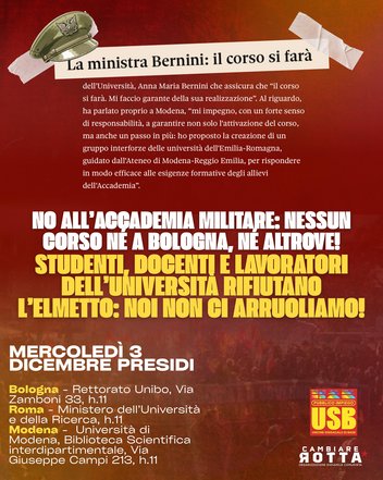 La saldatura della lotta di docenti, studenti e lavoratori uniti, costruita in questi anni di mobilitazione, ha prodotto importanti vittorie e avanzamenti sul piano del boicottaggio accademico (proprio come quella della bocciatura di tale corso) e ha fatto breccia in un modello universitario completamente indirizzato verso gli interessi di una classe dirigente guerrafondaia e complice del genocidio in Palestina: in questo senso l’alleanza e la mobilitazione devono proseguire contro i processi di militarizzazione degli atenei e il rilancio delle politiche di riarmo da parte del Governo Meloni sull’onda delle imposizioni della NATO e dell’ue.