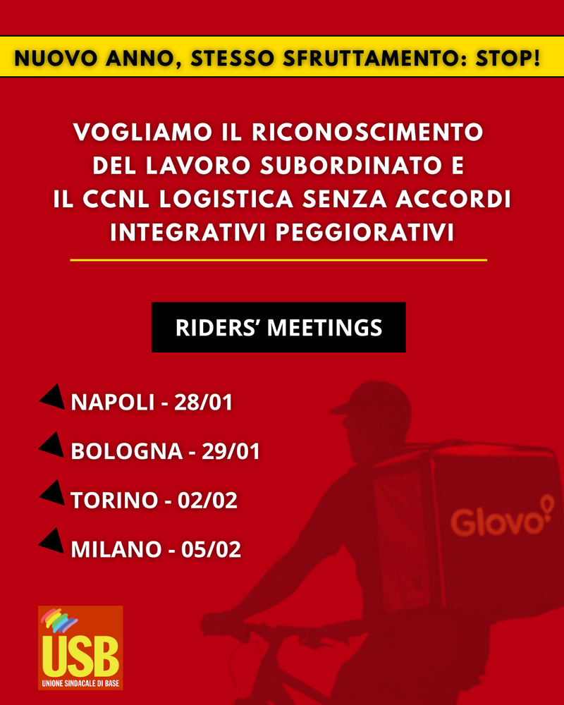 Per questo, come USB, apriamo il nuovo anno rilanciando le assemblee territoriali dei rider, per rafforzare vertenze e mobilitazioni, e costruire una risposta collettiva allo sfruttamento delle piattaforme.