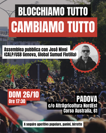 È ora di costruire un ampio fronte popolare contro il governo Meloni che non svenda la straordinaria partecipazione di queste settimane. Come Unione Sindacale di Base, assieme a Potere al Popolo e al CAU Padova invitiamo tutte e tutti ad un'ASSEMBLEA PUBBLICA per ragionare insieme su come procedere da ora in avanti. Sarà con noi José Nivoi, lavoratore portuale del CALP/USB Genova e membro dell'equipaggio della Global Sumud Flotilla.
