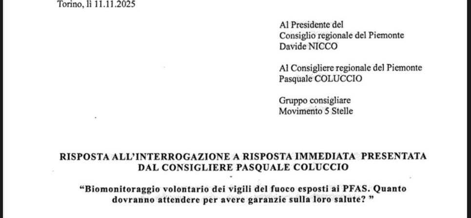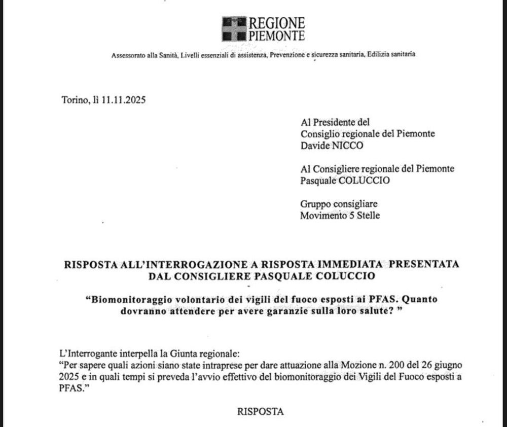 Accogliamo positivamente la risposta della Giunta piemontese all’interrogazione del consigliere Coluccio (M5S), presentata su richiesta USB Vigili del Fuoco, e l’impegno a includere i Vigili del Fuoco nello screening PFAS, tema che sarà trattato nella prossima Task Force entro fine anno.