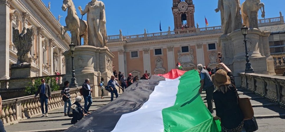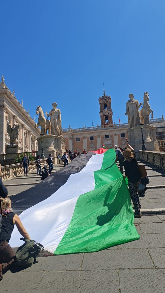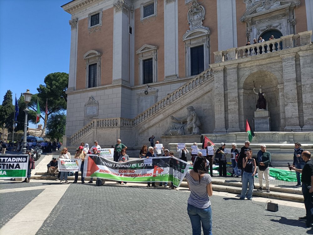 USB in piazza del Campidoglio con il coordinamento di forze che ha raccolto più di 16.000 firme per chiedere al Sindaco e al Consiglio comunale di esprimersi sulla rottura delle relazioni politiche, economiche, commerciali e di qualsiasi altro genere con lo stato criminale di Israele. Responsabile del genocidio del popolo palestinese.