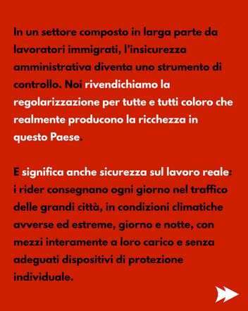 In un settore composto in larga parte da lavoratori immigrati, l’insicurezza amministrativa diventa uno strumento di controllo. Noi rivendichiamo la regolarizzazione per tutte e tutti coloro che realmente producono la ricchezza in questo Paese.