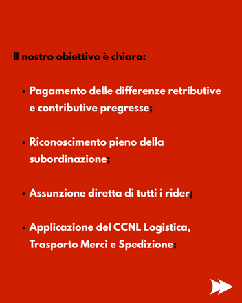 Il nostro obiettivo è chiaro: Pagamento delle differenze retributive e contributive pregresse; Riconoscimento pieno della subordinazione; Assunzione diretta di tutti i rider; Applicazione del CCNL Logistica, Trasporto Merci e Spedizione.