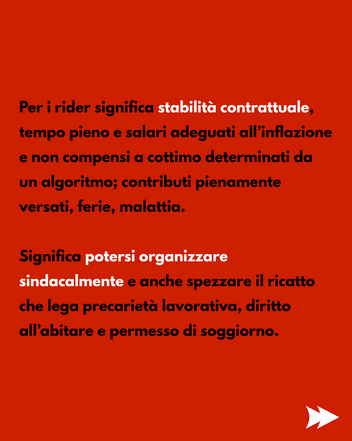 Per i rider significa stabilità contrattuale, tempo pieno e salari adeguati all’inflazione e non compensi a cottimo determinati da un algoritmo; contributi pienamente versati, ferie, malattia.