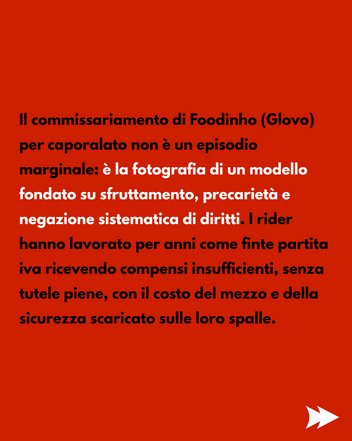 Il commissariamento di Foodinho (Glovo) per caporalato non è un episodio marginale: è la fotografia di un modello fondato su sfruttamento, precarietà e negazione sistematica di diritti. I rider hanno lavorato per anni come finte partita iva ricevendo compensi insufficienti, senza tutele piene, con il costo del mezzo e della sicurezza scaricato sulle loro spalle.