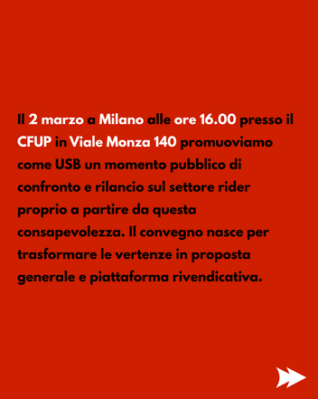 Il 2 marzo a Milano alle ore 16.00 presso il CFUP in Viale Monza 140 promuoviamo come USB un momento pubblico di confronto e rilancio sul settore rider proprio a partire da questa consapevolezza. Il convegno nasce per trasformare le vertenze in proposta generale e piattaforma rivendicativa.