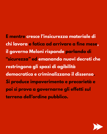 E mentre cresce l’insicurezza materiale di chi lavora e fatica ad arrivare a fine mese, il governo Meloni risponde parlando di “sicurezza” ed emanando nuovi decreti che restringono gli spazi di agibilità democratica e criminalizzano il dissenso.