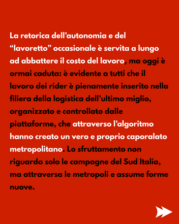 La retorica dell’autonomia e del “lavoretto” occasionale è servita a lungo ad abbattere il costo del lavoro, ma oggi è ormai caduta: è evidente a tutti che il lavoro dei rider è pienamente inserito nella filiera della logistica dell’ultimo miglio, organizzato e controllato dalle piattaforme, che attraverso l’algoritmo hanno creato un vero e proprio caporalato metropolitano. Lo sfruttamento non riguarda solo le campagne del Sud Italia, ma attraversa le metropoli e assume forme nuove.