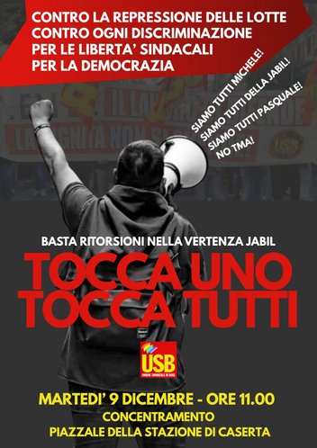 Non ci faremo intimidire: Lunedì 9 dicembre, ore 11, saremo a Caserta per una grande manifestazione di solidarietà con Michele Madonna e con tutti i lavoratori Jabil, colpiti da questa vergognosa offensiva antisindacale.