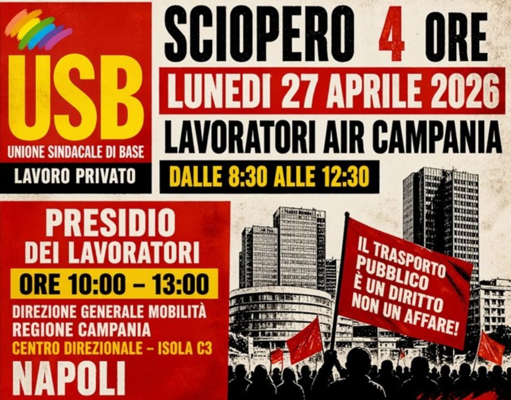 Lunedì 27 aprile 2026 sciopero di 4 ore che interesserà il personale dipendente di AIR Campania, dalle 8:30 alle 12:30.