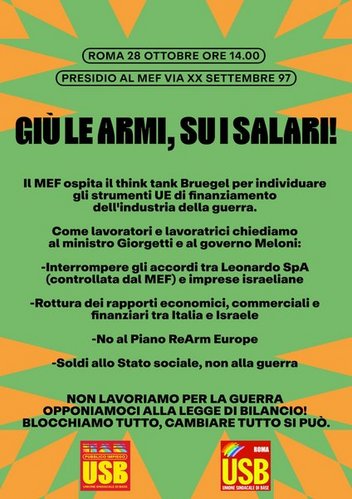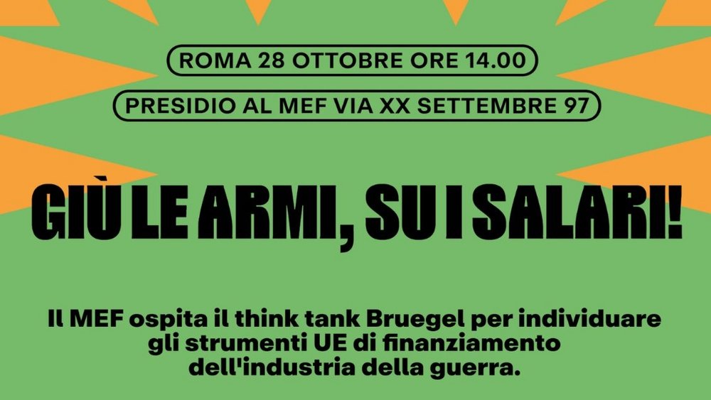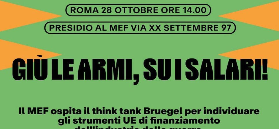 Apprendiamo con profonda preoccupazione che il Ministero dell'economia e delle finanze il prossimo 28 ottobre ospita il think tank Bruegel con l'obiettivo esplicito di individuare nuovi strumenti UE per il finanziamento dell'Industria della guerra.