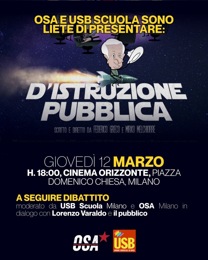 Giovedì 12 marzo alle 18.00 USB Scuola e OSA organizzano la presentazione del film “D’Istruzione pubblica”, documentario sullo smantellamento della scuola pubblica che sta suscitando grande interesse tra lavoratrici e lavoratori della scuola, tra le studentesse e gli studenti, ma anche tra le persone non direttamente coinvolte dalle tematiche trattate.