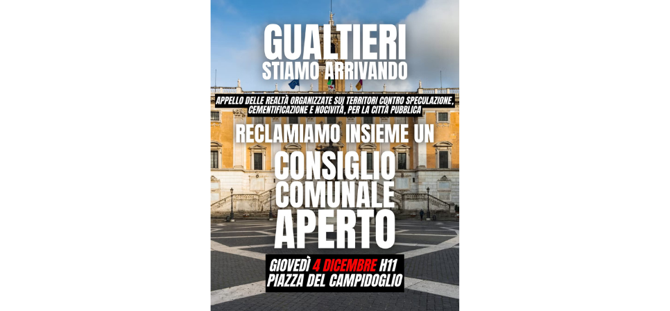 Reclamiamo insieme un consiglio comunale aperto. Giovedì 4 dicembre, ore 11 Piazza del Campidoglio. Appello delle realtà organizzate sui territori contro speculazione, cementificazione e nocività, per la città pubblica
