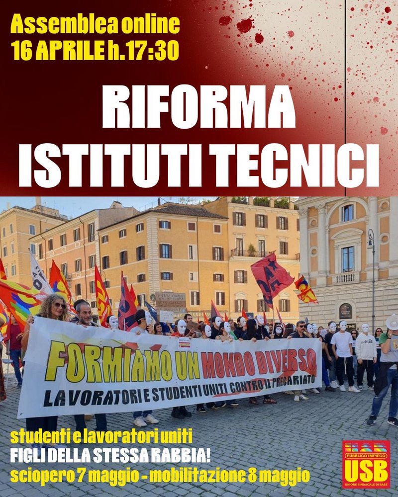 La battaglia sulla riforma degli istituti tecnici non è separabile da una resistenza più ampia da continuare a costruire dentro le scuole. La stessa logica che piega la scuola alle esigenze del mercato e della filiera produttiva è quella che vuole trasformare le giovani generazioni in forza lavoro disciplinata e in carne da cannone. Per questo USB, insieme a OSA e Cambiare Rotta, chiama a raccolta il mondo della scuola, dell’università e del lavoro per la mobilitazione nazionale dell’8 maggio contro la leva militare.